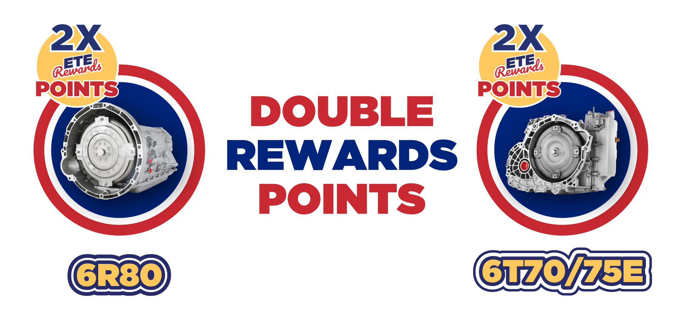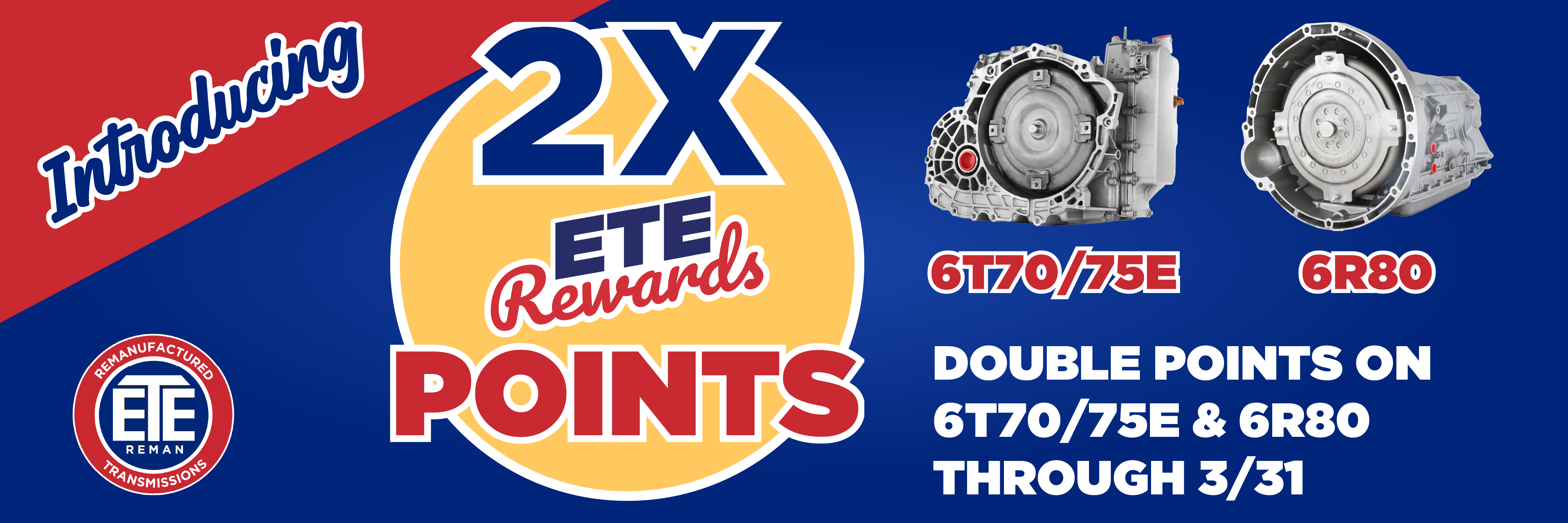 Now through the end of March, ETE REWARDS members can earn 2X ETE REWARDS points when purchasing three of the most in-demand transmissions in the industry: the 6R80 and 6T70/75E. It’s a new promotional benefit designed to help members accelerate their rewards while getting the transmissions they already rely on to keep repairs moving.
